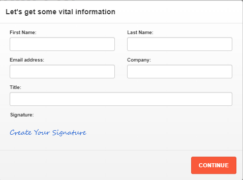 - Next, fill in the few Vital information fields and then click on ‘Create Your Signature’. After your signature is created then select ‘Continue’ to begin sending your document for a signature.
