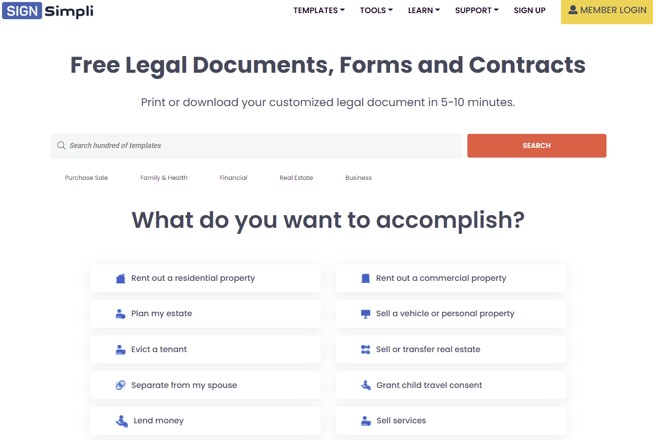 - By selecting ‘Create Document to Sign’ on the next page, choose the correct document you would like to send for a signature and create a document from our library of legal forms.