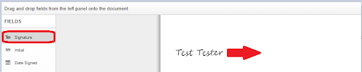 - Next, under ‘Fields’ select the ‘Signature’ then drag and drop using your cursor to place, click wherever you want the signature to appear. It appears with a blue box around it. You can move it by clicking inside the box and dragging to the desired location.
