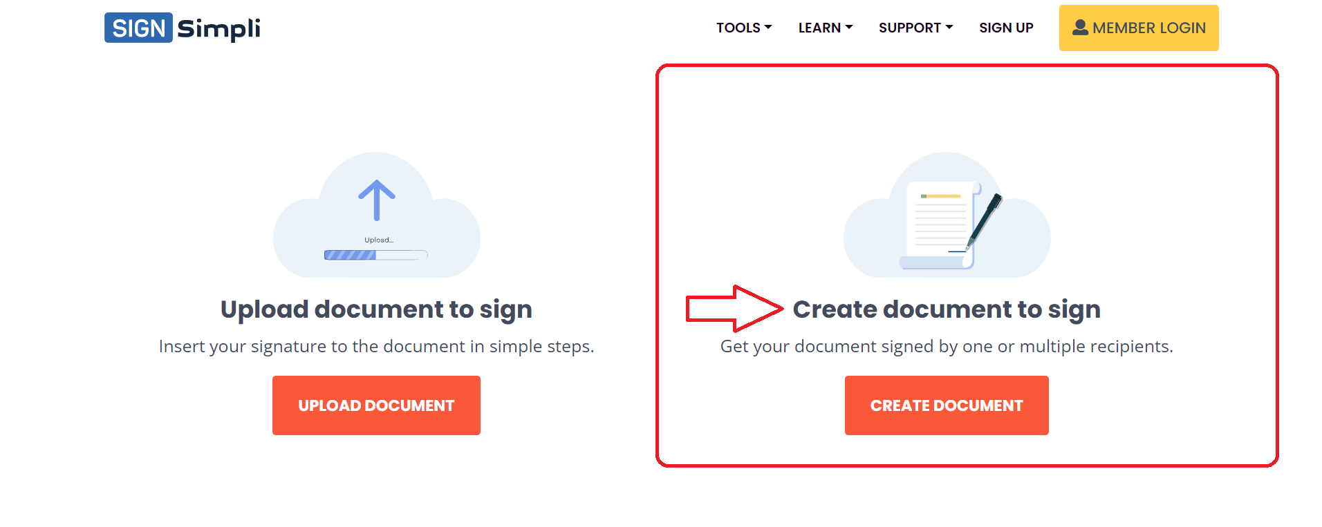 B. By selecting ‘Create Document to Sign’ on the next page, choose the correct document you would like to send for a signature and create a document from our library of legal forms.